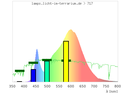 Whereas a spectrometer measures the intensity in every tiny wavelength interval resulting in thousands of individual intensities, the human eye only measures three intensities detected by the three cones. The same is true for the reptile eye with usually three or four photoreceptors. Effectively the detailled spectrum displayed above reduces to a much compacter bar graph displayed below. The photoreceptor sensitivites from these L-Cone, M-Cone, S-Cone, and U-Cone are used, they are chosen as an average of measured reptile photoreceptor sensitivity curves. The bar graph also shows as reference the intensity seen by the three or four photoreceptors for average sunlight (id 1).