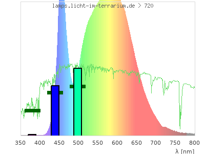 total ( 0 nm - 0 nm) 4100 µW/cm² = 41 W/m² UVC ( 0 nm - 280 nm) 0 µW/cm² = 0 W/m² non-terrestrial ( 0 nm - 290 nm) 0 µW/cm² = 0 W/m² total2 ( 250 nm - 880 nm) 4100 µW/cm² = 41 W/m² UVB (EU) ( 280 nm - 315 nm) 1.57 µW/cm² = 0.0157 W/m² UVB (US) ( 280 nm - 320 nm) 2 µW/cm² = 0.02 W/m² UVA+B ( 280 nm - 380 nm) 5.89 µW/cm² = 0.0589 W/m² Solar UVB ( 290 nm - 315 nm) 1.57 µW/cm² = 0.0157 W/m² UVA D3 regulating ( 315 nm - 335 nm) 1.61 µW/cm² = 0.0161 W/m² UVA (EU) ( 315 nm - 380 nm) 4.32 µW/cm² = 0.0432 W/m² UVA2 (medical definition) ( 320 nm - 340 nm) 1.42 µW/cm² = 0.0142 W/m² UVA (US) ( 320 nm - 380 nm) 3.9 µW/cm² = 0.039 W/m² UVA1 (variant) ( 335 nm - 380 nm) 2.71 µW/cm² = 0.0271 W/m² UVA1 (medical) ( 340 nm - 400 nm) 3.67 µW/cm² = 0.0367 W/m² vis. UVA ( 350 nm - 380 nm) 1.85 µW/cm² = 0.0185 W/m² VIS Rep3 ( 350 nm - 600 nm) 2860 µW/cm² = 28.6 W/m² VIS Rep4 ( 350 nm - 700 nm) 4000 µW/cm² = 40 W/m² purple ( 380 nm - 420 nm) 5.16 µW/cm² = 0.0516 W/m² VIS ( 380 nm - 780 nm) 4070 µW/cm² = 40.7 W/m² VIS2 ( 400 nm - 680 nm) 3920 µW/cm² = 39.2 W/m² PAR ( 400 nm - 700 nm) 3990 µW/cm² = 39.9 W/m² tmp ( 400 nm - 1100 nm) 4090 µW/cm² = 40.9 W/m² blue ( 420 nm - 490 nm) 851 µW/cm² = 8.51 W/m² green ( 490 nm - 575 nm) 1440 µW/cm² = 14.4 W/m² yellow ( 575 nm - 585 nm) 228 µW/cm² = 2.28 W/m² orange ( 585 nm - 650 nm) 1170 µW/cm² = 11.7 W/m² red ( 650 nm - 780 nm) 376 µW/cm² = 3.76 W/m² IRA ( 700 nm - 1400 nm) 97.3 µW/cm² = 0.973 W/m² IR2 ( 720 nm - 1100 nm) 61.5 µW/cm² = 0.615 W/m² IRB ( 1400 nm - 3000 nm) 0 µW/cm² = 0 W/m²