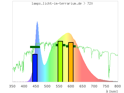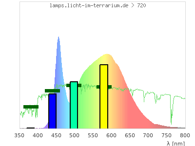 Whereas a spectrometer measures the intensity in every tiny wavelength interval resulting in thousands of individual intensities, the human eye only measures three intensities detected by the three cones. The same is true for the reptile eye with usually three or four photoreceptors. Effectively the detailled spectrum displayed above reduces to a much compacter bar graph displayed below. The photoreceptor sensitivites from these L-Cone, M-Cone, S-Cone, and U-Cone are used, they are chosen as an average of measured reptile photoreceptor sensitivity curves. The bar graph also shows as reference the intensity seen by the three or four photoreceptors for average sunlight (id 1).