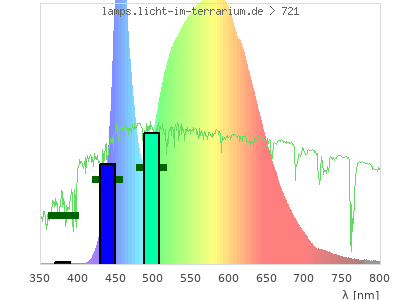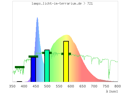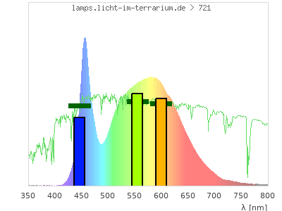 total ( 0 nm - 0 nm) 4080 µW/cm² = 40.8 W/m² UVC ( 0 nm - 280 nm) 0 µW/cm² = 0 W/m² non-terrestrial ( 0 nm - 290 nm) 0 µW/cm² = 0 W/m² total2 ( 250 nm - 880 nm) 4080 µW/cm² = 40.8 W/m² UVB (EU) ( 280 nm - 315 nm) 1.38 µW/cm² = 0.0138 W/m² UVB (US) ( 280 nm - 320 nm) 1.8 µW/cm² = 0.018 W/m² UVA+B ( 280 nm - 380 nm) 5.42 µW/cm² = 0.0542 W/m² Solar UVB ( 290 nm - 315 nm) 1.38 µW/cm² = 0.0138 W/m² UVA D3 regulating ( 315 nm - 335 nm) 1.44 µW/cm² = 0.0144 W/m² UVA (EU) ( 315 nm - 380 nm) 4.05 µW/cm² = 0.0405 W/m² UVA2 (medical definition) ( 320 nm - 340 nm) 1.23 µW/cm² = 0.0123 W/m² UVA (US) ( 320 nm - 380 nm) 3.62 µW/cm² = 0.0362 W/m² UVA1 (variant) ( 335 nm - 380 nm) 2.6 µW/cm² = 0.026 W/m² UVA1 (medical) ( 340 nm - 400 nm) 3.5 µW/cm² = 0.035 W/m² vis. UVA ( 350 nm - 380 nm) 1.83 µW/cm² = 0.0183 W/m² VIS Rep3 ( 350 nm - 600 nm) 2940 µW/cm² = 29.4 W/m² VIS Rep4 ( 350 nm - 700 nm) 3990 µW/cm² = 39.9 W/m² purple ( 380 nm - 420 nm) 5.24 µW/cm² = 0.0524 W/m² VIS ( 380 nm - 780 nm) 4060 µW/cm² = 40.6 W/m² VIS2 ( 400 nm - 680 nm) 3920 µW/cm² = 39.2 W/m² PAR ( 400 nm - 700 nm) 3980 µW/cm² = 39.8 W/m² tmp ( 400 nm - 1100 nm) 4070 µW/cm² = 40.7 W/m² blue ( 420 nm - 490 nm) 922 µW/cm² = 9.22 W/m² green ( 490 nm - 575 nm) 1470 µW/cm² = 14.7 W/m² yellow ( 575 nm - 585 nm) 223 µW/cm² = 2.23 W/m² orange ( 585 nm - 650 nm) 1090 µW/cm² = 10.9 W/m² red ( 650 nm - 780 nm) 346 µW/cm² = 3.46 W/m² IRA ( 700 nm - 1400 nm) 86.3 µW/cm² = 0.863 W/m² IR2 ( 720 nm - 1100 nm) 53 µW/cm² = 0.53 W/m² IRB ( 1400 nm - 3000 nm) 0 µW/cm² = 0 W/m²