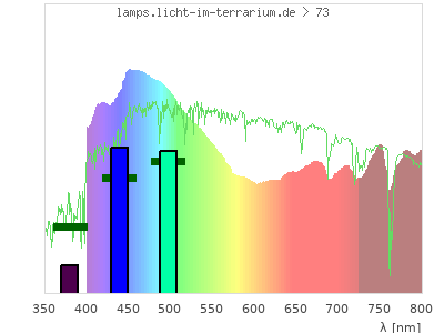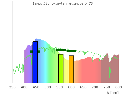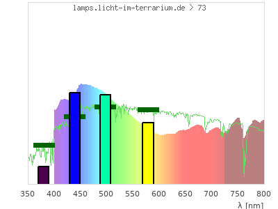 total ( 0 nm - 0 nm) 550 µW/cm² = 5.5 W/m² UVC ( 0 nm - 280 nm) 0 µW/cm² = 0 W/m² non-terrestrial ( 0 nm - 290 nm) 0 µW/cm² = 0 W/m² total2 ( 250 nm - 880 nm) 550 µW/cm² = 5.5 W/m² UVB (EU) ( 280 nm - 315 nm) 0 µW/cm² = 0 W/m² UVB (US) ( 280 nm - 320 nm) 0 µW/cm² = 0 W/m² UVA+B ( 280 nm - 380 nm) 0 µW/cm² = 0 W/m² Solar UVB ( 290 nm - 315 nm) 0 µW/cm² = 0 W/m² UVA D3 regulating ( 315 nm - 335 nm) 0 µW/cm² = 0 W/m² UVA (EU) ( 315 nm - 380 nm) 0 µW/cm² = 0 W/m² UVA2 (medical definition) ( 320 nm - 340 nm) 0 µW/cm² = 0 W/m² UVA (US) ( 320 nm - 380 nm) 0 µW/cm² = 0 W/m² UVA1 (variant) ( 335 nm - 380 nm) 0 µW/cm² = 0 W/m² UVA1 (medical) ( 340 nm - 400 nm) 0 µW/cm² = 0 W/m² vis. UVA ( 350 nm - 380 nm) 0 µW/cm² = 0 W/m² VIS Rep3 ( 350 nm - 600 nm) 323 µW/cm² = 3.23 W/m² VIS Rep4 ( 350 nm - 700 nm) 432 µW/cm² = 4.32 W/m² purple ( 380 nm - 420 nm) 32.9 µW/cm² = 0.329 W/m² VIS ( 380 nm - 780 nm) 524 µW/cm² = 5.24 W/m² VIS2 ( 400 nm - 680 nm) 410 µW/cm² = 4.1 W/m² PAR ( 400 nm - 700 nm) 432 µW/cm² = 4.32 W/m² tmp ( 400 nm - 1100 nm) 550 µW/cm² = 5.5 W/m² blue ( 420 nm - 490 nm) 135 µW/cm² = 1.35 W/m² green ( 490 nm - 575 nm) 129 µW/cm² = 1.29 W/m² yellow ( 575 nm - 585 nm) 10.7 µW/cm² = 0.107 W/m² orange ( 585 nm - 650 nm) 67.8 µW/cm² = 0.678 W/m² red ( 650 nm - 780 nm) 149 µW/cm² = 1.49 W/m² IRA ( 700 nm - 1400 nm) 118 µW/cm² = 1.18 W/m² IR2 ( 720 nm - 1100 nm) 95.4 µW/cm² = 0.954 W/m² IRB ( 1400 nm - 3000 nm) 0 µW/cm² = 0 W/m²