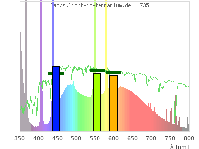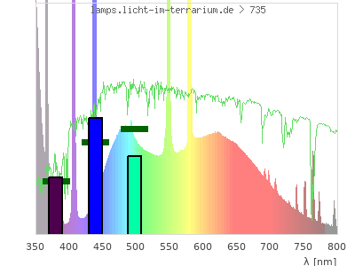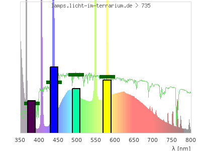 Whereas a spectrometer measures the intensity in every tiny wavelength interval resulting in thousands of individual intensities, the human eye only measures three intensities detected by the three cones. The same is true for the reptile eye with usually three or four photoreceptors. Effectively the detailled spectrum displayed above reduces to a much compacter bar graph displayed below. The photoreceptor sensitivites from these L-Cone, M-Cone, S-Cone, and U-Cone are used, they are chosen as an average of measured reptile photoreceptor sensitivity curves. The bar graph also shows as reference the intensity seen by the three or four photoreceptors for average sunlight (id 1).