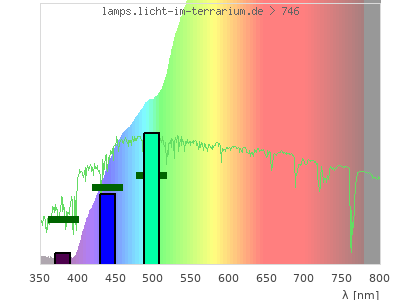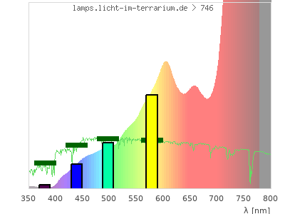 Whereas a spectrometer measures the intensity in every tiny wavelength interval resulting in thousands of individual intensities, the human eye only measures three intensities detected by the three cones. The same is true for the reptile eye with usually three or four photoreceptors. Effectively the detailled spectrum displayed above reduces to a much compacter bar graph displayed below. The photoreceptor sensitivites from these L-Cone, M-Cone, S-Cone, and U-Cone are used, they are chosen as an average of measured reptile photoreceptor sensitivity curves. The bar graph also shows as reference the intensity seen by the three or four photoreceptors for average sunlight (id 1).