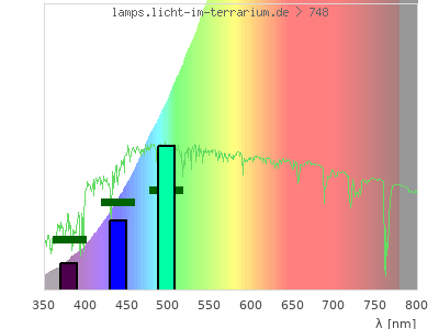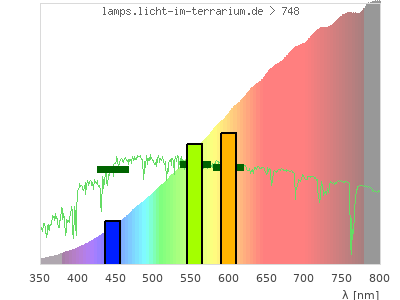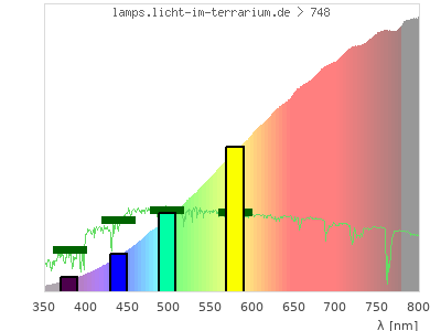 Whereas a spectrometer measures the intensity in every tiny wavelength interval resulting in thousands of individual intensities, the human eye only measures three intensities detected by the three cones. The same is true for the reptile eye with usually three or four photoreceptors. Effectively the detailled spectrum displayed above reduces to a much compacter bar graph displayed below. The photoreceptor sensitivites from these L-Cone, M-Cone, S-Cone, and U-Cone are used, they are chosen as an average of measured reptile photoreceptor sensitivity curves. The bar graph also shows as reference the intensity seen by the three or four photoreceptors for average sunlight (id 1).