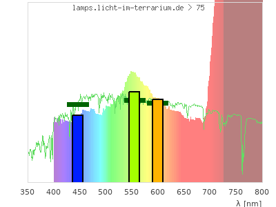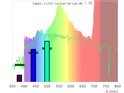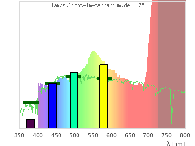 Whereas a spectrometer measures the intensity in every tiny wavelength interval resulting in thousands of individual intensities, the human eye only measures three intensities detected by the three cones. The same is true for the reptile eye with usually three or four photoreceptors. Effectively the detailled spectrum displayed above reduces to a much compacter bar graph displayed below. The photoreceptor sensitivites from these L-Cone, M-Cone, S-Cone, and U-Cone are used, they are chosen as an average of measured reptile photoreceptor sensitivity curves. The bar graph also shows as reference the intensity seen by the three or four photoreceptors for average sunlight (id 1).