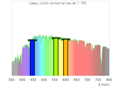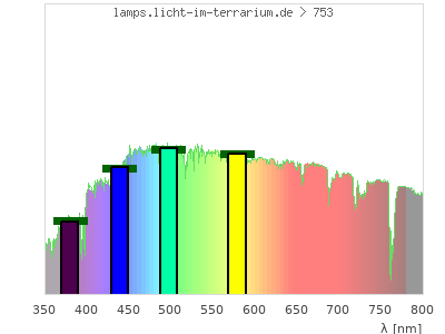 Whereas a spectrometer measures the intensity in every tiny wavelength interval resulting in thousands of individual intensities, the human eye only measures three intensities detected by the three cones. The same is true for the reptile eye with usually three or four photoreceptors. Effectively the detailled spectrum displayed above reduces to a much compacter bar graph displayed below. The photoreceptor sensitivites from these L-Cone, M-Cone, S-Cone, and U-Cone are used, they are chosen as an average of measured reptile photoreceptor sensitivity curves. The bar graph also shows as reference the intensity seen by the three or four photoreceptors for average sunlight (id 1).