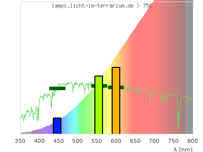 Whereas a spectrometer measures the intensity in every tiny wavelength interval resulting in thousands of individual intensities, the human eye only measures three intensities detected by the three cones. The same is true for the reptile eye with usually three or four photoreceptors. Effectively the detailled spectrum displayed above reduces to a much compacter bar graph displayed below. The photoreceptor sensitivites from these L-Cone, M-Cone, S-Cone, and U-Cone are used, they are chosen as an average of measured reptile photoreceptor sensitivity curves. The bar graph also shows as reference the intensity seen by the three or four photoreceptors for average sunlight (id 1).