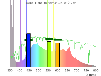 Whereas a spectrometer measures the intensity in every tiny wavelength interval resulting in thousands of individual intensities, the human eye only measures three intensities detected by the three cones. The same is true for the reptile eye with usually three or four photoreceptors. Effectively the detailled spectrum displayed above reduces to a much compacter bar graph displayed below. The photoreceptor sensitivites from these L-Cone, M-Cone, S-Cone, and U-Cone are used, they are chosen as an average of measured reptile photoreceptor sensitivity curves. The bar graph also shows as reference the intensity seen by the three or four photoreceptors for average sunlight (id 1).