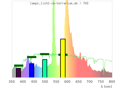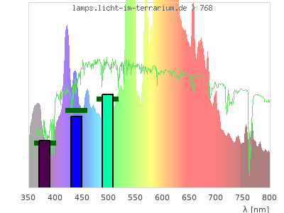 Whereas a spectrometer measures the intensity in every tiny wavelength interval resulting in thousands of individual intensities, the human eye only measures three intensities detected by the three cones. The same is true for the reptile eye with usually three or four photoreceptors. Effectively the detailled spectrum displayed above reduces to a much compacter bar graph displayed below. The photoreceptor sensitivites from these L-Cone, M-Cone, S-Cone, and U-Cone are used, they are chosen as an average of measured reptile photoreceptor sensitivity curves. The bar graph also shows as reference the intensity seen by the three or four photoreceptors for average sunlight (id 1).