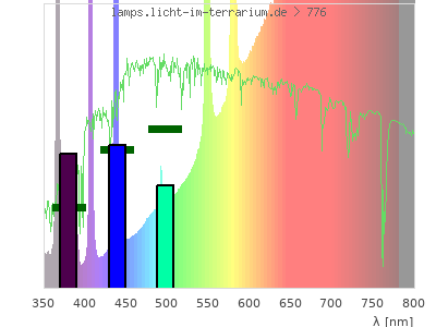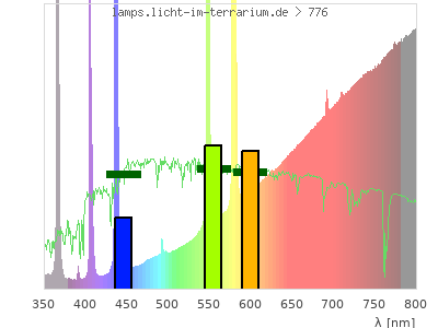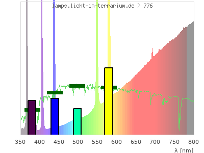 Whereas a spectrometer measures the intensity in every tiny wavelength interval resulting in thousands of individual intensities, the human eye only measures three intensities detected by the three cones. The same is true for the reptile eye with usually three or four photoreceptors. Effectively the detailled spectrum displayed above reduces to a much compacter bar graph displayed below. The photoreceptor sensitivites from these L-Cone, M-Cone, S-Cone, and U-Cone are used, they are chosen as an average of measured reptile photoreceptor sensitivity curves. The bar graph also shows as reference the intensity seen by the three or four photoreceptors for average sunlight (id 1).