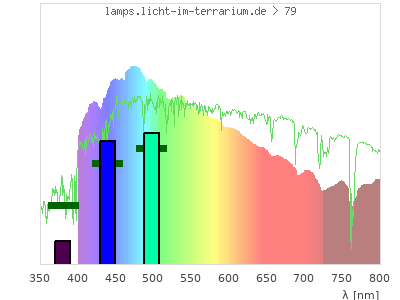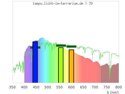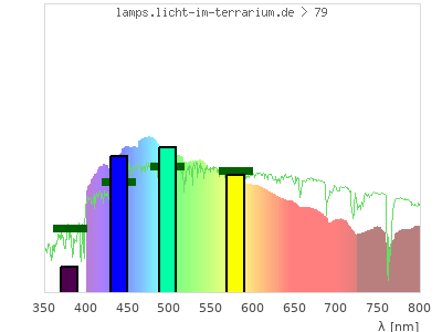 total ( 0 nm - 0 nm) 9950 µW/cm² = 99.5 W/m² UVC ( 0 nm - 280 nm) 0 µW/cm² = 0 W/m² non-terrestrial ( 0 nm - 290 nm) 0 µW/cm² = 0 W/m² total2 ( 250 nm - 880 nm) 9950 µW/cm² = 99.5 W/m² UVB (EU) ( 280 nm - 315 nm) 0 µW/cm² = 0 W/m² UVB (US) ( 280 nm - 320 nm) 0 µW/cm² = 0 W/m² UVA+B ( 280 nm - 380 nm) 0 µW/cm² = 0 W/m² Solar UVB ( 290 nm - 315 nm) 0 µW/cm² = 0 W/m² UVA D3 regulating ( 315 nm - 335 nm) 0 µW/cm² = 0 W/m² UVA (EU) ( 315 nm - 380 nm) 0 µW/cm² = 0 W/m² UVA2 (medical definition) ( 320 nm - 340 nm) 0 µW/cm² = 0 W/m² UVA (US) ( 320 nm - 380 nm) 0 µW/cm² = 0 W/m² UVA1 (variant) ( 335 nm - 380 nm) 0 µW/cm² = 0 W/m² UVA1 (medical) ( 340 nm - 400 nm) 0 µW/cm² = 0 W/m² vis. UVA ( 350 nm - 380 nm) 0 µW/cm² = 0 W/m² VIS Rep3 ( 350 nm - 600 nm) 6300 µW/cm² = 63 W/m² VIS Rep4 ( 350 nm - 700 nm) 8450 µW/cm² = 84.5 W/m² purple ( 380 nm - 420 nm) 562 µW/cm² = 5.62 W/m² VIS ( 380 nm - 780 nm) 9640 µW/cm² = 96.4 W/m² VIS2 ( 400 nm - 680 nm) 8100 µW/cm² = 81 W/m² PAR ( 400 nm - 700 nm) 8450 µW/cm² = 84.5 W/m² tmp ( 400 nm - 1100 nm) 9950 µW/cm² = 99.5 W/m² blue ( 420 nm - 490 nm) 2410 µW/cm² = 24.1 W/m² green ( 490 nm - 575 nm) 2660 µW/cm² = 26.6 W/m² yellow ( 575 nm - 585 nm) 276 µW/cm² = 2.76 W/m² orange ( 585 nm - 650 nm) 1580 µW/cm² = 15.8 W/m² red ( 650 nm - 780 nm) 2150 µW/cm² = 21.5 W/m² IRA ( 700 nm - 1400 nm) 1490 µW/cm² = 14.9 W/m² IR2 ( 720 nm - 1100 nm) 1160 µW/cm² = 11.6 W/m² IRB ( 1400 nm - 3000 nm) 0 µW/cm² = 0 W/m²