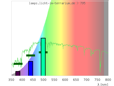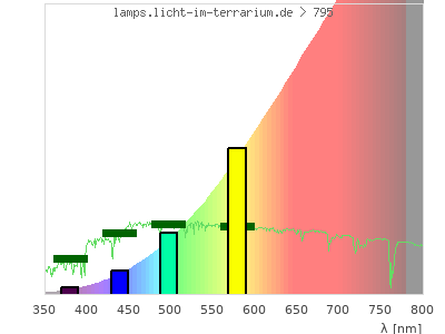 Whereas a spectrometer measures the intensity in every tiny wavelength interval resulting in thousands of individual intensities, the human eye only measures three intensities detected by the three cones. The same is true for the reptile eye with usually three or four photoreceptors. Effectively the detailled spectrum displayed above reduces to a much compacter bar graph displayed below. The photoreceptor sensitivites from these L-Cone, M-Cone, S-Cone, and U-Cone are used, they are chosen as an average of measured reptile photoreceptor sensitivity curves. The bar graph also shows as reference the intensity seen by the three or four photoreceptors for average sunlight (id 1).