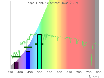 Erythema 0.0364 UV-Index Pyrimidine dimerization of DNA 0.261 µW/cm² Photoceratitis 0.00463 µW/cm² Photoconjunctivitis 0 µW/cm² DNA Damage 0.000207 Vitamin D3 0.00559 µW/cm² Photosynthesis 7930 µW/cm² Luminosity 30300 lx Human L-Cone 4750 µW/cm² Human M-Cone 3330 µW/cm² Human S-Cone 832 µW/cm² CIE X 4560 µW/cm² CIE Y 4220 µW/cm² CIE Z 1600 µW/cm² PAR PPFD 561 µmol/m²/s Extinction preD3 0.872 e-3*m²/mol Extinction Tachysterol 3.67 e-3*m²/mol Exctincition PreD3 788 m²/mol Extinction Lumisterol 0 m²/mol Exctincition Tachysterol 10900 m²/mol Extinction 7DHC 0 m²/mol L-Cone 4430 µW/cm² M-Cone 2470 µW/cm² S-Cone 1240 µW/cm² U-Cone 501 µW/cm² UVR - ICNIRP 2004 0.0219 Rel Biol Eff Melatonin Supression 1460 µW/cm² Blue Light Hazard 946 µW/cm² (31.2 µW/cm² per 1000 lx) CIE 174:2006 PreVit D3 0.00543 µW/cm² Lumen Reptil 22900 "pseudo-lx" Vitamin D3 Degradation 0.184 µW/cm² Actinic UV 0.0219 µW/cm² (0.00722 mW/klm) Exctincition Lumisterol 38.9 m²/mol Exctincition 7DHC 6.79 m²/mol Exctincition Toxisterols 300 m²/mol