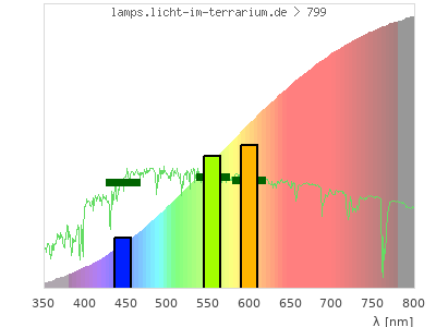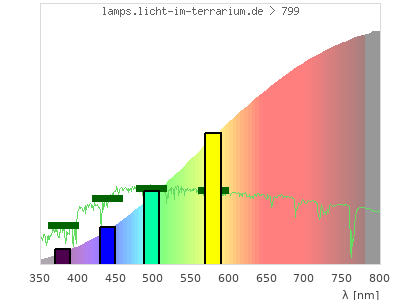 Whereas a spectrometer measures the intensity in every tiny wavelength interval resulting in thousands of individual intensities, the human eye only measures three intensities detected by the three cones. The same is true for the reptile eye with usually three or four photoreceptors. Effectively the detailled spectrum displayed above reduces to a much compacter bar graph displayed below. The photoreceptor sensitivites from these L-Cone, M-Cone, S-Cone, and U-Cone are used, they are chosen as an average of measured reptile photoreceptor sensitivity curves. The bar graph also shows as reference the intensity seen by the three or four photoreceptors for average sunlight (id 1).