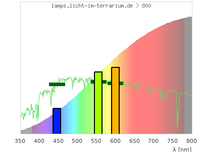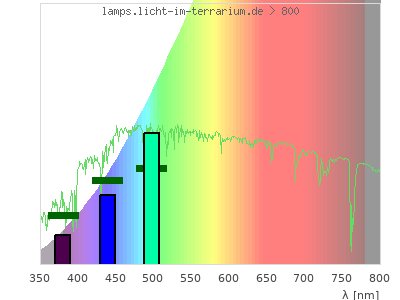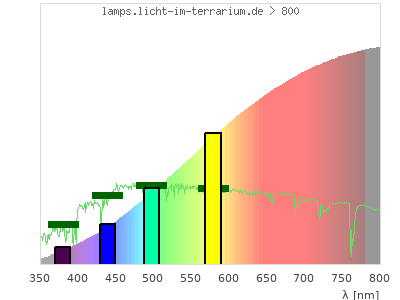 Whereas a spectrometer measures the intensity in every tiny wavelength interval resulting in thousands of individual intensities, the human eye only measures three intensities detected by the three cones. The same is true for the reptile eye with usually three or four photoreceptors. Effectively the detailled spectrum displayed above reduces to a much compacter bar graph displayed below. The photoreceptor sensitivites from these L-Cone, M-Cone, S-Cone, and U-Cone are used, they are chosen as an average of measured reptile photoreceptor sensitivity curves. The bar graph also shows as reference the intensity seen by the three or four photoreceptors for average sunlight (id 1).