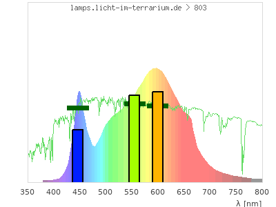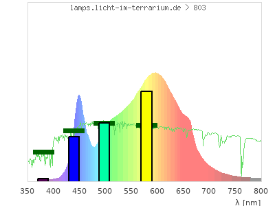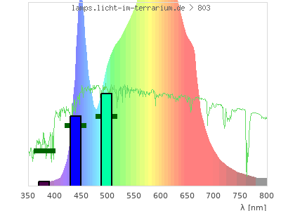 total ( 0 nm - 0 nm) 179 µW/cm² = 1.79 W/m² UVC ( 0 nm - 280 nm) 0 µW/cm² = 0 W/m² non-terrestrial ( 0 nm - 290 nm) 0 µW/cm² = 0 W/m² total2 ( 250 nm - 880 nm) 179 µW/cm² = 1.79 W/m² UVB (EU) ( 280 nm - 315 nm) 0 µW/cm² = 0 W/m² UVB (US) ( 280 nm - 320 nm) 0 µW/cm² = 0 W/m² UVA+B ( 280 nm - 380 nm) 0.184 µW/cm² = 0.00184 W/m² Solar UVB ( 290 nm - 315 nm) 0 µW/cm² = 0 W/m² UVA D3 regulating ( 315 nm - 335 nm) 0 µW/cm² = 0 W/m² UVA (EU) ( 315 nm - 380 nm) 0.184 µW/cm² = 0.00184 W/m² UVA2 (medical definition) ( 320 nm - 340 nm) 0 µW/cm² = 0 W/m² UVA (US) ( 320 nm - 380 nm) 0.184 µW/cm² = 0.00184 W/m² UVA1 (variant) ( 335 nm - 380 nm) 0.184 µW/cm² = 0.00184 W/m² UVA1 (medical) ( 340 nm - 400 nm) 0.723 µW/cm² = 0.00723 W/m² vis. UVA ( 350 nm - 380 nm) 0.184 µW/cm² = 0.00184 W/m² VIS Rep3 ( 350 nm - 600 nm) 115 µW/cm² = 1.15 W/m² VIS Rep4 ( 350 nm - 700 nm) 174 µW/cm² = 1.74 W/m² purple ( 380 nm - 420 nm) 1.35 µW/cm² = 0.0135 W/m² VIS ( 380 nm - 780 nm) 179 µW/cm² = 1.79 W/m² VIS2 ( 400 nm - 680 nm) 169 µW/cm² = 1.69 W/m² PAR ( 400 nm - 700 nm) 173 µW/cm² = 1.73 W/m² tmp ( 400 nm - 1100 nm) 178 µW/cm² = 1.78 W/m² blue ( 420 nm - 490 nm) 32.1 µW/cm² = 0.321 W/m² green ( 490 nm - 575 nm) 56.6 µW/cm² = 0.566 W/m² yellow ( 575 nm - 585 nm) 12.5 µW/cm² = 0.125 W/m² orange ( 585 nm - 650 nm) 52.8 µW/cm² = 0.528 W/m² red ( 650 nm - 780 nm) 23.2 µW/cm² = 0.232 W/m² IRA ( 700 nm - 1400 nm) 4.99 µW/cm² = 0.0499 W/m² IR2 ( 720 nm - 1100 nm) 3.74 µW/cm² = 0.0374 W/m² IRB ( 1400 nm - 3000 nm) 0 µW/cm² = 0 W/m²
