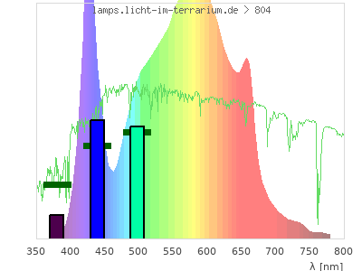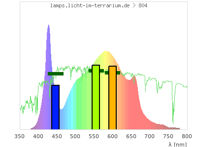 total ( 0 nm - 0 nm) 154 µW/cm² = 1.54 W/m² UVC ( 0 nm - 280 nm) 0 µW/cm² = 0 W/m² non-terrestrial ( 0 nm - 290 nm) 0 µW/cm² = 0 W/m² total2 ( 250 nm - 880 nm) 154 µW/cm² = 1.54 W/m² UVB (EU) ( 280 nm - 315 nm) 0 µW/cm² = 0 W/m² UVB (US) ( 280 nm - 320 nm) 0 µW/cm² = 0 W/m² UVA+B ( 280 nm - 380 nm) 0.123 µW/cm² = 0.00123 W/m² Solar UVB ( 290 nm - 315 nm) 0 µW/cm² = 0 W/m² UVA D3 regulating ( 315 nm - 335 nm) 0 µW/cm² = 0 W/m² UVA (EU) ( 315 nm - 380 nm) 0.123 µW/cm² = 0.00123 W/m² UVA2 (medical definition) ( 320 nm - 340 nm) 0 µW/cm² = 0 W/m² UVA (US) ( 320 nm - 380 nm) 0.123 µW/cm² = 0.00123 W/m² UVA1 (variant) ( 335 nm - 380 nm) 0.123 µW/cm² = 0.00123 W/m² UVA1 (medical) ( 340 nm - 400 nm) 1.25 µW/cm² = 0.0125 W/m² vis. UVA ( 350 nm - 380 nm) 0.123 µW/cm² = 0.00123 W/m² VIS Rep3 ( 350 nm - 600 nm) 111 µW/cm² = 1.11 W/m² VIS Rep4 ( 350 nm - 700 nm) 151 µW/cm² = 1.51 W/m² purple ( 380 nm - 420 nm) 8.68 µW/cm² = 0.0868 W/m² VIS ( 380 nm - 780 nm) 154 µW/cm² = 1.54 W/m² VIS2 ( 400 nm - 680 nm) 149 µW/cm² = 1.49 W/m² PAR ( 400 nm - 700 nm) 150 µW/cm² = 1.5 W/m² tmp ( 400 nm - 1100 nm) 153 µW/cm² = 1.53 W/m² blue ( 420 nm - 490 nm) 31.6 µW/cm² = 0.316 W/m² green ( 490 nm - 575 nm) 50.9 µW/cm² = 0.509 W/m² yellow ( 575 nm - 585 nm) 9.13 µW/cm² = 0.0913 W/m² orange ( 585 nm - 650 nm) 37.9 µW/cm² = 0.379 W/m² red ( 650 nm - 780 nm) 16.1 µW/cm² = 0.161 W/m² IRA ( 700 nm - 1400 nm) 2.94 µW/cm² = 0.0294 W/m² IR2 ( 720 nm - 1100 nm) 1.05 µW/cm² = 0.0105 W/m² IRB ( 1400 nm - 3000 nm) 0 µW/cm² = 0 W/m²