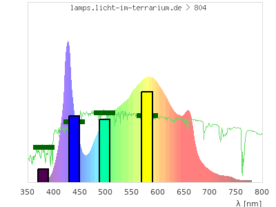 Whereas a spectrometer measures the intensity in every tiny wavelength interval resulting in thousands of individual intensities, the human eye only measures three intensities detected by the three cones. The same is true for the reptile eye with usually three or four photoreceptors. Effectively the detailled spectrum displayed above reduces to a much compacter bar graph displayed below. The photoreceptor sensitivites from these L-Cone, M-Cone, S-Cone, and U-Cone are used, they are chosen as an average of measured reptile photoreceptor sensitivity curves. The bar graph also shows as reference the intensity seen by the three or four photoreceptors for average sunlight (id 1).