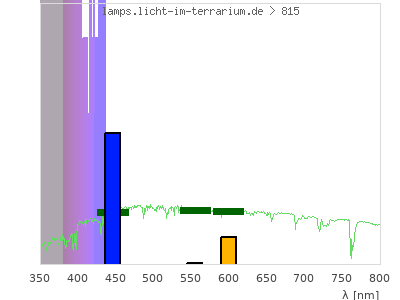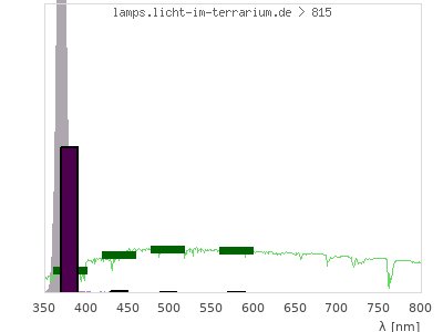 total ( 0 nm - 0 nm) 495 µW/cm² = 4.95 W/m² UVC ( 0 nm - 280 nm) 0 µW/cm² = 0 W/m² non-terrestrial ( 0 nm - 290 nm) 0 µW/cm² = 0 W/m² total2 ( 250 nm - 880 nm) 495 µW/cm² = 4.95 W/m² UVB (EU) ( 280 nm - 315 nm) 0 µW/cm² = 0 W/m² UVB (US) ( 280 nm - 320 nm) 0 µW/cm² = 0 W/m² UVA+B ( 280 nm - 380 nm) 485 µW/cm² = 4.85 W/m² Solar UVB ( 290 nm - 315 nm) 0 µW/cm² = 0 W/m² UVA D3 regulating ( 315 nm - 335 nm) 0.448 µW/cm² = 0.00448 W/m² UVA (EU) ( 315 nm - 380 nm) 485 µW/cm² = 4.85 W/m² UVA2 (medical definition) ( 320 nm - 340 nm) 0.734 µW/cm² = 0.00734 W/m² UVA (US) ( 320 nm - 380 nm) 485 µW/cm² = 4.85 W/m² UVA1 (variant) ( 335 nm - 380 nm) 485 µW/cm² = 4.85 W/m² UVA1 (medical) ( 340 nm - 400 nm) 493 µW/cm² = 4.93 W/m² vis. UVA ( 350 nm - 380 nm) 484 µW/cm² = 4.84 W/m² VIS Rep3 ( 350 nm - 600 nm) 493 µW/cm² = 4.93 W/m² VIS Rep4 ( 350 nm - 700 nm) 493 µW/cm² = 4.93 W/m² purple ( 380 nm - 420 nm) 9.01 µW/cm² = 0.0901 W/m² VIS ( 380 nm - 780 nm) 9.51 µW/cm² = 0.0951 W/m² VIS2 ( 400 nm - 680 nm) 0.986 µW/cm² = 0.00986 W/m² PAR ( 400 nm - 700 nm) 0.986 µW/cm² = 0.00986 W/m² tmp ( 400 nm - 1100 nm) 0.986 µW/cm² = 0.00986 W/m² blue ( 420 nm - 490 nm) 0.506 µW/cm² = 0.00506 W/m² green ( 490 nm - 575 nm) 0 µW/cm² = 0 W/m² yellow ( 575 nm - 585 nm) 0 µW/cm² = 0 W/m² orange ( 585 nm - 650 nm) 0 µW/cm² = 0 W/m² red ( 650 nm - 780 nm) 0 µW/cm² = 0 W/m² IRA ( 700 nm - 1400 nm) 0 µW/cm² = 0 W/m² IR2 ( 720 nm - 1100 nm) 0 µW/cm² = 0 W/m² IRB ( 1400 nm - 3000 nm) 0 µW/cm² = 0 W/m²