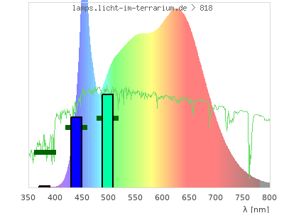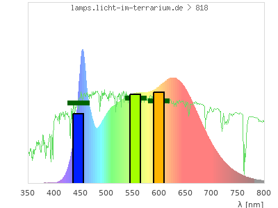 total ( 0 nm - 0 nm) 5990 µW/cm² = 59.9 W/m² UVC ( 0 nm - 280 nm) 0 µW/cm² = 0 W/m² non-terrestrial ( 0 nm - 290 nm) 0 µW/cm² = 0 W/m² total2 ( 250 nm - 880 nm) 5990 µW/cm² = 59.9 W/m² UVB (EU) ( 280 nm - 315 nm) 0 µW/cm² = 0 W/m² UVB (US) ( 280 nm - 320 nm) 0 µW/cm² = 0 W/m² UVA+B ( 280 nm - 380 nm) 0 µW/cm² = 0 W/m² Solar UVB ( 290 nm - 315 nm) 0 µW/cm² = 0 W/m² UVA D3 regulating ( 315 nm - 335 nm) 0 µW/cm² = 0 W/m² UVA (EU) ( 315 nm - 380 nm) 0 µW/cm² = 0 W/m² UVA2 (medical definition) ( 320 nm - 340 nm) 0 µW/cm² = 0 W/m² UVA (US) ( 320 nm - 380 nm) 0 µW/cm² = 0 W/m² UVA1 (variant) ( 335 nm - 380 nm) 0 µW/cm² = 0 W/m² UVA1 (medical) ( 340 nm - 400 nm) 1.88 µW/cm² = 0.0188 W/m² vis. UVA ( 350 nm - 380 nm) 0 µW/cm² = 0 W/m² VIS Rep3 ( 350 nm - 600 nm) 3510 µW/cm² = 35.1 W/m² VIS Rep4 ( 350 nm - 700 nm) 5620 µW/cm² = 56.2 W/m² purple ( 380 nm - 420 nm) 16.2 µW/cm² = 0.162 W/m² VIS ( 380 nm - 780 nm) 5940 µW/cm² = 59.4 W/m² VIS2 ( 400 nm - 680 nm) 5360 µW/cm² = 53.6 W/m² PAR ( 400 nm - 700 nm) 5610 µW/cm² = 56.1 W/m² tmp ( 400 nm - 1100 nm) 5990 µW/cm² = 59.9 W/m² blue ( 420 nm - 490 nm) 1170 µW/cm² = 11.7 W/m² green ( 490 nm - 575 nm) 1740 µW/cm² = 17.4 W/m² yellow ( 575 nm - 585 nm) 232 µW/cm² = 2.32 W/m² orange ( 585 nm - 650 nm) 1620 µW/cm² = 16.2 W/m² red ( 650 nm - 780 nm) 1160 µW/cm² = 11.6 W/m² IRA ( 700 nm - 1400 nm) 372 µW/cm² = 3.72 W/m² IR2 ( 720 nm - 1100 nm) 216 µW/cm² = 2.16 W/m² IRB ( 1400 nm - 3000 nm) 0 µW/cm² = 0 W/m²