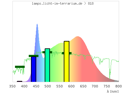 Erythema 0.000126 UV-Index Pyrimidine dimerization of DNA 0 µW/cm² Photoceratitis 0 µW/cm² Photoconjunctivitis 0 µW/cm² DNA Damage 0 Vitamin D3 0 µW/cm² Photosynthesis 3840 µW/cm² Luminosity 17000 lx Human L-Cone 2580 µW/cm² Human M-Cone 2010 µW/cm² Human S-Cone 940 µW/cm² CIE X 2410 µW/cm² CIE Y 2360 µW/cm² CIE Z 1850 µW/cm² PAR PPFD 265 µmol/m²/s Extinction preD3 0 e-3*m²/mol Extinction Tachysterol 0 e-3*m²/mol Exctincition PreD3 0 m²/mol Extinction Lumisterol 0 m²/mol Exctincition Tachysterol 0 m²/mol Extinction 7DHC 0 m²/mol L-Cone 2270 µW/cm² M-Cone 1860 µW/cm² S-Cone 1420 µW/cm² U-Cone 35.2 µW/cm² UVR - ICNIRP 2004 8.02E-5 Rel Biol Eff Melatonin Supression 1400 µW/cm² Blue Light Hazard 985 µW/cm² (58.1 µW/cm² per 1000 lx) CIE 174:2006 PreVit D3 0 µW/cm² Lumen Reptil 14100 "pseudo-lx" Vitamin D3 Degradation 0 µW/cm² Actinic UV 8.01E-5 µW/cm² (4.72E-5 mW/klm) Exctincition Lumisterol 0 m²/mol Exctincition 7DHC 0 m²/mol Exctincition Toxisterols 0 m²/mol