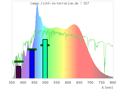 Erythema 0.0859 UV-Index Pyrimidine dimerization of DNA 0.644 µW/cm² Photoceratitis 0.0602 µW/cm² Photoconjunctivitis 0 µW/cm² DNA Damage 0.00073 Vitamin D3 0.124 µW/cm² Photosynthesis 7980 µW/cm² Luminosity 32500 lx Human L-Cone 4880 µW/cm² Human M-Cone 4000 µW/cm² Human S-Cone 2130 µW/cm² CIE X 4390 µW/cm² CIE Y 4500 µW/cm² CIE Z 4090 µW/cm² PAR PPFD 540 µmol/m²/s Extinction preD3 2.14 e-3*m²/mol Extinction Tachysterol 8.09 e-3*m²/mol Exctincition PreD3 1050 m²/mol Extinction Lumisterol 0.0286 m²/mol Exctincition Tachysterol 12300 m²/mol Extinction 7DHC 0 m²/mol L-Cone 4190 µW/cm² M-Cone 4420 µW/cm² S-Cone 3230 µW/cm² U-Cone 1390 µW/cm² UVR - ICNIRP 2004 0.0477 Rel Biol Eff Melatonin Supression 3430 µW/cm² Blue Light Hazard 2390 µW/cm² (73.4 µW/cm² per 1000 lx) CIE 174:2006 PreVit D3 0.108 µW/cm² Lumen Reptil 31800 "pseudo-lx" Vitamin D3 Degradation 0.438 µW/cm² Actinic UV 0.0478 µW/cm² (0.0147 mW/klm) Exctincition Lumisterol 143 m²/mol Exctincition 7DHC 34.8 m²/mol Exctincition Toxisterols 234 m²/mol