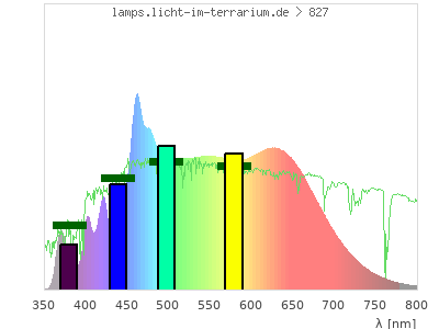 total ( 0 nm - 0 nm) 12700 µW/cm² = 127 W/m² UVC ( 0 nm - 280 nm) 0 µW/cm² = 0 W/m² non-terrestrial ( 0 nm - 290 nm) 0 µW/cm² = 0 W/m² total2 ( 250 nm - 880 nm) 12700 µW/cm² = 127 W/m² UVB (EU) ( 280 nm - 315 nm) 1.21 µW/cm² = 0.0121 W/m² UVB (US) ( 280 nm - 320 nm) 2.64 µW/cm² = 0.0264 W/m² UVA+B ( 280 nm - 380 nm) 292 µW/cm² = 2.92 W/m² Solar UVB ( 290 nm - 315 nm) 1.21 µW/cm² = 0.0121 W/m² UVA D3 regulating ( 315 nm - 335 nm) 5.33 µW/cm² = 0.0533 W/m² UVA (EU) ( 315 nm - 380 nm) 291 µW/cm² = 2.91 W/m² UVA2 (medical definition) ( 320 nm - 340 nm) 5.1 µW/cm² = 0.051 W/m² UVA (US) ( 320 nm - 380 nm) 289 µW/cm² = 2.89 W/m² UVA1 (variant) ( 335 nm - 380 nm) 286 µW/cm² = 2.86 W/m² UVA1 (medical) ( 340 nm - 400 nm) 492 µW/cm² = 4.92 W/m² vis. UVA ( 350 nm - 380 nm) 282 µW/cm² = 2.82 W/m² VIS Rep3 ( 350 nm - 600 nm) 8300 µW/cm² = 83 W/m² VIS Rep4 ( 350 nm - 700 nm) 12000 µW/cm² = 120 W/m² purple ( 380 nm - 420 nm) 644 µW/cm² = 6.44 W/m² VIS ( 380 nm - 780 nm) 12300 µW/cm² = 123 W/m² VIS2 ( 400 nm - 680 nm) 11000 µW/cm² = 110 W/m² PAR ( 400 nm - 700 nm) 11500 µW/cm² = 115 W/m² tmp ( 400 nm - 1100 nm) 12200 µW/cm² = 122 W/m² blue ( 420 nm - 490 nm) 2780 µW/cm² = 27.8 W/m² green ( 490 nm - 575 nm) 3570 µW/cm² = 35.7 W/m² yellow ( 575 nm - 585 nm) 416 µW/cm² = 4.16 W/m² orange ( 585 nm - 650 nm) 2800 µW/cm² = 28 W/m² red ( 650 nm - 780 nm) 2100 µW/cm² = 21 W/m² IRA ( 700 nm - 1400 nm) 691 µW/cm² = 6.91 W/m² IR2 ( 720 nm - 1100 nm) 404 µW/cm² = 4.04 W/m² IRB ( 1400 nm - 3000 nm) 0 µW/cm² = 0 W/m²