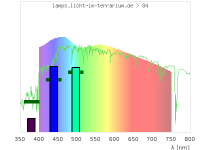 Whereas a spectrometer measures the intensity in every tiny wavelength interval resulting in thousands of individual intensities, the human eye only measures three intensities detected by the three cones. The same is true for the reptile eye with usually three or four photoreceptors. Effectively the detailled spectrum displayed above reduces to a much compacter bar graph displayed below. The photoreceptor sensitivites from these L-Cone, M-Cone, S-Cone, and U-Cone are used, they are chosen as an average of measured reptile photoreceptor sensitivity curves. The bar graph also shows as reference the intensity seen by the three or four photoreceptors for average sunlight (id 1).
