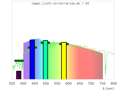 total ( 0 nm - 0 nm) 29400 µW/cm² = 294 W/m² UVC ( 0 nm - 280 nm) 0 µW/cm² = 0 W/m² non-terrestrial ( 0 nm - 290 nm) 0 µW/cm² = 0 W/m² total2 ( 250 nm - 880 nm) 29400 µW/cm² = 294 W/m² UVB (EU) ( 280 nm - 315 nm) 0 µW/cm² = 0 W/m² UVB (US) ( 280 nm - 320 nm) 0 µW/cm² = 0 W/m² UVA+B ( 280 nm - 380 nm) 0 µW/cm² = 0 W/m² Solar UVB ( 290 nm - 315 nm) 0 µW/cm² = 0 W/m² UVA D3 regulating ( 315 nm - 335 nm) 0 µW/cm² = 0 W/m² UVA (EU) ( 315 nm - 380 nm) 0 µW/cm² = 0 W/m² UVA2 (medical definition) ( 320 nm - 340 nm) 0 µW/cm² = 0 W/m² UVA (US) ( 320 nm - 380 nm) 0 µW/cm² = 0 W/m² UVA1 (variant) ( 335 nm - 380 nm) 0 µW/cm² = 0 W/m² UVA1 (medical) ( 340 nm - 400 nm) 0 µW/cm² = 0 W/m² vis. UVA ( 350 nm - 380 nm) 0 µW/cm² = 0 W/m² VIS Rep3 ( 350 nm - 600 nm) 18200 µW/cm² = 182 W/m² VIS Rep4 ( 350 nm - 700 nm) 26000 µW/cm² = 260 W/m² purple ( 380 nm - 420 nm) 1780 µW/cm² = 17.8 W/m² VIS ( 380 nm - 780 nm) 29400 µW/cm² = 294 W/m² VIS2 ( 400 nm - 680 nm) 24600 µW/cm² = 246 W/m² PAR ( 400 nm - 700 nm) 26000 µW/cm² = 260 W/m² tmp ( 400 nm - 1100 nm) 29400 µW/cm² = 294 W/m² blue ( 420 nm - 490 nm) 6680 µW/cm² = 66.8 W/m² green ( 490 nm - 575 nm) 7530 µW/cm² = 75.3 W/m² yellow ( 575 nm - 585 nm) 887 µW/cm² = 8.87 W/m² orange ( 585 nm - 650 nm) 5430 µW/cm² = 54.3 W/m² red ( 650 nm - 780 nm) 7070 µW/cm² = 70.7 W/m² IRA ( 700 nm - 1400 nm) 3330 µW/cm² = 33.3 W/m² IR2 ( 720 nm - 1100 nm) 1950 µW/cm² = 19.5 W/m² IRB ( 1400 nm - 3000 nm) 0 µW/cm² = 0 W/m²