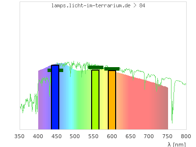 Erythema 0 UV-Index Pyrimidine dimerization of DNA 0 µW/cm² Photoceratitis 0 µW/cm² Photoconjunctivitis 0 µW/cm² DNA Damage 0 Vitamin D3 0 µW/cm² Photosynthesis 18700 µW/cm² Luminosity 67800 lx Human L-Cone 10100 µW/cm² Human M-Cone 8420 µW/cm² Human S-Cone 5520 µW/cm² CIE X 9320 µW/cm² CIE Y 9380 µW/cm² CIE Z 10100 µW/cm² PAR PPFD 1230 µmol/m²/s Extinction preD3 0 e-3*m²/mol Extinction Tachysterol 0 e-3*m²/mol Exctincition PreD3 0 m²/mol Extinction Lumisterol 0 m²/mol Exctincition Tachysterol 0 m²/mol Extinction 7DHC 0 m²/mol L-Cone 8660 µW/cm² M-Cone 9060 µW/cm² S-Cone 9190 µW/cm² U-Cone 1880 µW/cm² UVR - ICNIRP 2004 0 Rel Biol Eff Melatonin Supression 8210 µW/cm² Blue Light Hazard 6370 µW/cm² (93.9 µW/cm² per 1000 lx) CIE 174:2006 PreVit D3 0 µW/cm² Lumen Reptil 69400 "pseudo-lx" Vitamin D3 Degradation 0 µW/cm² Actinic UV 0 µW/cm² (0 mW/klm) Exctincition Lumisterol 0 m²/mol Exctincition 7DHC 0 m²/mol Exctincition Toxisterols 0 m²/mol