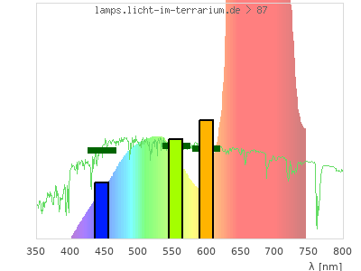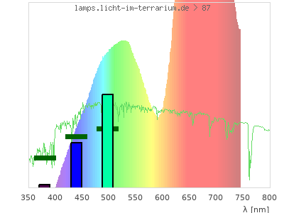 total ( 0 nm - 0 nm) 3700 µW/cm² = 37 W/m² UVC ( 0 nm - 280 nm) 0 µW/cm² = 0 W/m² non-terrestrial ( 0 nm - 290 nm) 0 µW/cm² = 0 W/m² total2 ( 250 nm - 880 nm) 3700 µW/cm² = 37 W/m² UVB (EU) ( 280 nm - 315 nm) 0 µW/cm² = 0 W/m² UVB (US) ( 280 nm - 320 nm) 0 µW/cm² = 0 W/m² UVA+B ( 280 nm - 380 nm) 0 µW/cm² = 0 W/m² Solar UVB ( 290 nm - 315 nm) 0 µW/cm² = 0 W/m² UVA D3 regulating ( 315 nm - 335 nm) 0 µW/cm² = 0 W/m² UVA (EU) ( 315 nm - 380 nm) 0 µW/cm² = 0 W/m² UVA2 (medical definition) ( 320 nm - 340 nm) 0 µW/cm² = 0 W/m² UVA (US) ( 320 nm - 380 nm) 0 µW/cm² = 0 W/m² UVA1 (variant) ( 335 nm - 380 nm) 0 µW/cm² = 0 W/m² UVA1 (medical) ( 340 nm - 400 nm) 0 µW/cm² = 0 W/m² vis. UVA ( 350 nm - 380 nm) 0 µW/cm² = 0 W/m² VIS Rep3 ( 350 nm - 600 nm) 879 µW/cm² = 8.79 W/m² VIS Rep4 ( 350 nm - 700 nm) 3040 µW/cm² = 30.4 W/m² purple ( 380 nm - 420 nm) 15.3 µW/cm² = 0.153 W/m² VIS ( 380 nm - 780 nm) 3700 µW/cm² = 37 W/m² VIS2 ( 400 nm - 680 nm) 2500 µW/cm² = 25 W/m² PAR ( 400 nm - 700 nm) 3040 µW/cm² = 30.4 W/m² tmp ( 400 nm - 1100 nm) 3700 µW/cm² = 37 W/m² blue ( 420 nm - 490 nm) 267 µW/cm² = 2.67 W/m² green ( 490 nm - 575 nm) 510 µW/cm² = 5.1 W/m² yellow ( 575 nm - 585 nm) 36.3 µW/cm² = 0.363 W/m² orange ( 585 nm - 650 nm) 806 µW/cm² = 8.06 W/m² red ( 650 nm - 780 nm) 2070 µW/cm² = 20.7 W/m² IRA ( 700 nm - 1400 nm) 664 µW/cm² = 6.64 W/m² IR2 ( 720 nm - 1100 nm) 251 µW/cm² = 2.51 W/m² IRB ( 1400 nm - 3000 nm) 0 µW/cm² = 0 W/m²