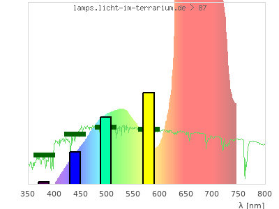 Whereas a spectrometer measures the intensity in every tiny wavelength interval resulting in thousands of individual intensities, the human eye only measures three intensities detected by the three cones. The same is true for the reptile eye with usually three or four photoreceptors. Effectively the detailled spectrum displayed above reduces to a much compacter bar graph displayed below. The photoreceptor sensitivites from these L-Cone, M-Cone, S-Cone, and U-Cone are used, they are chosen as an average of measured reptile photoreceptor sensitivity curves. The bar graph also shows as reference the intensity seen by the three or four photoreceptors for average sunlight (id 1).