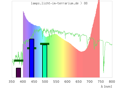 Whereas a spectrometer measures the intensity in every tiny wavelength interval resulting in thousands of individual intensities, the human eye only measures three intensities detected by the three cones. The same is true for the reptile eye with usually three or four photoreceptors. Effectively the detailled spectrum displayed above reduces to a much compacter bar graph displayed below. The photoreceptor sensitivites from these L-Cone, M-Cone, S-Cone, and U-Cone are used, they are chosen as an average of measured reptile photoreceptor sensitivity curves. The bar graph also shows as reference the intensity seen by the three or four photoreceptors for average sunlight (id 1).