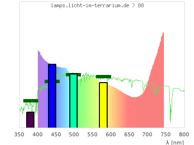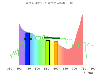 total ( 0 nm - 0 nm) 309 µW/cm² = 3.09 W/m² UVC ( 0 nm - 280 nm) 0 µW/cm² = 0 W/m² non-terrestrial ( 0 nm - 290 nm) 0 µW/cm² = 0 W/m² total2 ( 250 nm - 880 nm) 309 µW/cm² = 3.09 W/m² UVB (EU) ( 280 nm - 315 nm) 0 µW/cm² = 0 W/m² UVB (US) ( 280 nm - 320 nm) 0 µW/cm² = 0 W/m² UVA+B ( 280 nm - 380 nm) 0 µW/cm² = 0 W/m² Solar UVB ( 290 nm - 315 nm) 0 µW/cm² = 0 W/m² UVA D3 regulating ( 315 nm - 335 nm) 0 µW/cm² = 0 W/m² UVA (EU) ( 315 nm - 380 nm) 0 µW/cm² = 0 W/m² UVA2 (medical definition) ( 320 nm - 340 nm) 0 µW/cm² = 0 W/m² UVA (US) ( 320 nm - 380 nm) 0 µW/cm² = 0 W/m² UVA1 (variant) ( 335 nm - 380 nm) 0 µW/cm² = 0 W/m² UVA1 (medical) ( 340 nm - 400 nm) 0 µW/cm² = 0 W/m² vis. UVA ( 350 nm - 380 nm) 0 µW/cm² = 0 W/m² VIS Rep3 ( 350 nm - 600 nm) 193 µW/cm² = 1.93 W/m² VIS Rep4 ( 350 nm - 700 nm) 255 µW/cm² = 2.55 W/m² purple ( 380 nm - 420 nm) 25.3 µW/cm² = 0.253 W/m² VIS ( 380 nm - 780 nm) 309 µW/cm² = 3.09 W/m² VIS2 ( 400 nm - 680 nm) 242 µW/cm² = 2.42 W/m² PAR ( 400 nm - 700 nm) 255 µW/cm² = 2.55 W/m² tmp ( 400 nm - 1100 nm) 309 µW/cm² = 3.09 W/m² blue ( 420 nm - 490 nm) 75.4 µW/cm² = 0.754 W/m² green ( 490 nm - 575 nm) 73.5 µW/cm² = 0.735 W/m² yellow ( 575 nm - 585 nm) 7.9 µW/cm² = 0.079 W/m² orange ( 585 nm - 650 nm) 43.7 µW/cm² = 0.437 W/m² red ( 650 nm - 780 nm) 83.3 µW/cm² = 0.833 W/m² IRA ( 700 nm - 1400 nm) 53.8 µW/cm² = 0.538 W/m² IR2 ( 720 nm - 1100 nm) 33.5 µW/cm² = 0.335 W/m² IRB ( 1400 nm - 3000 nm) 0 µW/cm² = 0 W/m²