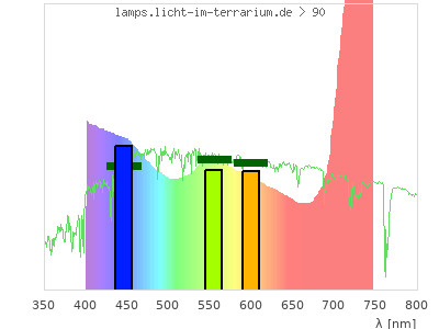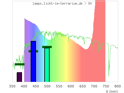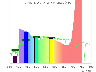 Whereas a spectrometer measures the intensity in every tiny wavelength interval resulting in thousands of individual intensities, the human eye only measures three intensities detected by the three cones. The same is true for the reptile eye with usually three or four photoreceptors. Effectively the detailled spectrum displayed above reduces to a much compacter bar graph displayed below. The photoreceptor sensitivites from these L-Cone, M-Cone, S-Cone, and U-Cone are used, they are chosen as an average of measured reptile photoreceptor sensitivity curves. The bar graph also shows as reference the intensity seen by the three or four photoreceptors for average sunlight (id 1).