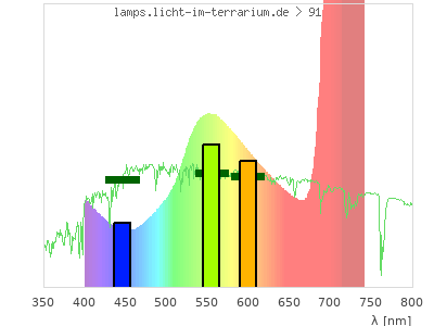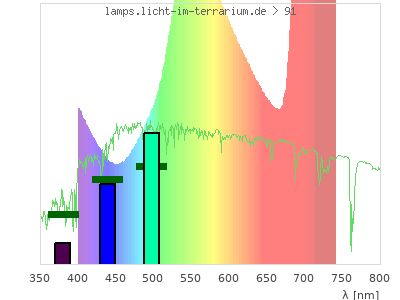 total ( 0 nm - 0 nm) 357 µW/cm² = 3.57 W/m² UVC ( 0 nm - 280 nm) 0 µW/cm² = 0 W/m² non-terrestrial ( 0 nm - 290 nm) 0 µW/cm² = 0 W/m² total2 ( 250 nm - 880 nm) 357 µW/cm² = 3.57 W/m² UVB (EU) ( 280 nm - 315 nm) 0 µW/cm² = 0 W/m² UVB (US) ( 280 nm - 320 nm) 0 µW/cm² = 0 W/m² UVA+B ( 280 nm - 380 nm) 0 µW/cm² = 0 W/m² Solar UVB ( 290 nm - 315 nm) 0 µW/cm² = 0 W/m² UVA D3 regulating ( 315 nm - 335 nm) 0 µW/cm² = 0 W/m² UVA (EU) ( 315 nm - 380 nm) 0 µW/cm² = 0 W/m² UVA2 (medical definition) ( 320 nm - 340 nm) 0 µW/cm² = 0 W/m² UVA (US) ( 320 nm - 380 nm) 0 µW/cm² = 0 W/m² UVA1 (variant) ( 335 nm - 380 nm) 0 µW/cm² = 0 W/m² UVA1 (medical) ( 340 nm - 400 nm) 0 µW/cm² = 0 W/m² vis. UVA ( 350 nm - 380 nm) 0 µW/cm² = 0 W/m² VIS Rep3 ( 350 nm - 600 nm) 114 µW/cm² = 1.14 W/m² VIS Rep4 ( 350 nm - 700 nm) 187 µW/cm² = 1.87 W/m² purple ( 380 nm - 420 nm) 8.33 µW/cm² = 0.0833 W/m² VIS ( 380 nm - 780 nm) 357 µW/cm² = 3.57 W/m² VIS2 ( 400 nm - 680 nm) 158 µW/cm² = 1.58 W/m² PAR ( 400 nm - 700 nm) 187 µW/cm² = 1.87 W/m² tmp ( 400 nm - 1100 nm) 357 µW/cm² = 3.57 W/m² blue ( 420 nm - 490 nm) 23.3 µW/cm² = 0.233 W/m² green ( 490 nm - 575 nm) 62.8 µW/cm² = 0.628 W/m² yellow ( 575 nm - 585 nm) 8.18 µW/cm² = 0.0818 W/m² orange ( 585 nm - 650 nm) 41 µW/cm² = 0.41 W/m² red ( 650 nm - 780 nm) 214 µW/cm² = 2.14 W/m² IRA ( 700 nm - 1400 nm) 170 µW/cm² = 1.7 W/m² IR2 ( 720 nm - 1100 nm) 105 µW/cm² = 1.05 W/m² IRB ( 1400 nm - 3000 nm) 0 µW/cm² = 0 W/m²