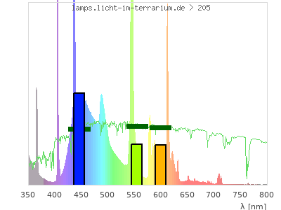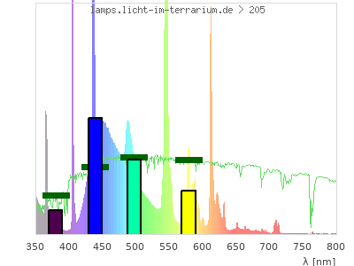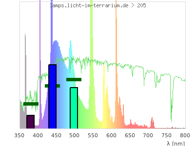 total ( 0 nm - 0 nm) 1070 µW/cm² = 10.7 W/m² UVC ( 0 nm - 280 nm) 2.8 µW/cm² = 0.028 W/m² non-terrestrial ( 0 nm - 290 nm) 4.18 µW/cm² = 0.0418 W/m² total2 ( 250 nm - 880 nm) 1070 µW/cm² = 10.7 W/m² UVB (EU) ( 280 nm - 315 nm) 71.2 µW/cm² = 0.712 W/m² UVB (US) ( 280 nm - 320 nm) 99.6 µW/cm² = 0.996 W/m² UVA+B ( 280 nm - 380 nm) 260 µW/cm² = 2.6 W/m² Solar UVB ( 290 nm - 315 nm) 69.8 µW/cm² = 0.698 W/m² UVA D3 regulating ( 315 nm - 335 nm) 105 µW/cm² = 1.05 W/m² UVA (EU) ( 315 nm - 380 nm) 189 µW/cm² = 1.89 W/m² UVA2 (medical definition) ( 320 nm - 340 nm) 95.2 µW/cm² = 0.952 W/m² UVA (US) ( 320 nm - 380 nm) 160 µW/cm² = 1.6 W/m² UVA1 (variant) ( 335 nm - 380 nm) 83.4 µW/cm² = 0.834 W/m² UVA1 (medical) ( 340 nm - 400 nm) 69.9 µW/cm² = 0.699 W/m² vis. UVA ( 350 nm - 380 nm) 41.1 µW/cm² = 0.411 W/m² VIS Rep3 ( 350 nm - 600 nm) 760 µW/cm² = 7.6 W/m² VIS Rep4 ( 350 nm - 700 nm) 835 µW/cm² = 8.35 W/m² purple ( 380 nm - 420 nm) 45 µW/cm² = 0.45 W/m² VIS ( 380 nm - 780 nm) 801 µW/cm² = 8.01 W/m² VIS2 ( 400 nm - 680 nm) 787 µW/cm² = 7.87 W/m² PAR ( 400 nm - 700 nm) 790 µW/cm² = 7.9 W/m² tmp ( 400 nm - 1100 nm) 798 µW/cm² = 7.98 W/m² blue ( 420 nm - 490 nm) 393 µW/cm² = 3.93 W/m² green ( 490 nm - 575 nm) 238 µW/cm² = 2.38 W/m² yellow ( 575 nm - 585 nm) 22.3 µW/cm² = 0.223 W/m² orange ( 585 nm - 650 nm) 85.6 µW/cm² = 0.856 W/m² red ( 650 nm - 780 nm) 17 µW/cm² = 0.17 W/m² IRA ( 700 nm - 1400 nm) 8.08 µW/cm² = 0.0808 W/m² IR2 ( 720 nm - 1100 nm) 3.33 µW/cm² = 0.0333 W/m² IRB ( 1400 nm - 3000 nm) 0 µW/cm² = 0 W/m²