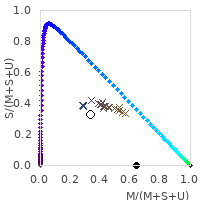 From these three numbers the colour coordinate and the correlated colour temperature for humans are calculated using the CIE standard method. I adapted this concept to a "3 cone reptile (M,S,U)" and a "4 cone reptile (L,M,S,U)". I am sure, that this adaption to other colour spaces makes sense mathematically and this is also done in scientific research regarding colour vision of animals, however I have not seen calculation of colour temperatures for other animals in the scientific literature. Even if it is hypothetical, at least this shows, how arbitrary the colour temperature is, and that the colour temperature calculated for humans does not apply to reptiles. The colour spaces also show the colour coordinates of different phases of daylight ((ids 1, 338 – 451, 511 – 513 ), indicated by crosses, coloured in the appriximate colour perceived by a human.