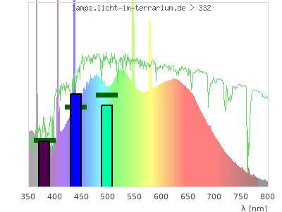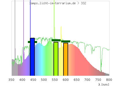 total ( 0 nm - 0 nm) 678 µW/cm² = 6.78 W/m² UVC ( 0 nm - 280 nm) 0.054 µW/cm² = 0.00054 W/m² non-terrestrial ( 0 nm - 290 nm) 0.054 µW/cm² = 0.00054 W/m² total2 ( 250 nm - 880 nm) 678 µW/cm² = 6.78 W/m² UVB (EU) ( 280 nm - 315 nm) 4.56 µW/cm² = 0.0456 W/m² UVB (US) ( 280 nm - 320 nm) 4.89 µW/cm² = 0.0489 W/m² UVA+B ( 280 nm - 380 nm) 54 µW/cm² = 0.54 W/m² Solar UVB ( 290 nm - 315 nm) 4.56 µW/cm² = 0.0456 W/m² UVA D3 regulating ( 315 nm - 335 nm) 4.64 µW/cm² = 0.0464 W/m² UVA (EU) ( 315 nm - 380 nm) 49.5 µW/cm² = 0.495 W/m² UVA2 (medical definition) ( 320 nm - 340 nm) 7.4 µW/cm² = 0.074 W/m² UVA (US) ( 320 nm - 380 nm) 49.2 µW/cm² = 0.492 W/m² UVA1 (variant) ( 335 nm - 380 nm) 44.8 µW/cm² = 0.448 W/m² UVA1 (medical) ( 340 nm - 400 nm) 56.1 µW/cm² = 0.561 W/m² vis. UVA ( 350 nm - 380 nm) 33.4 µW/cm² = 0.334 W/m² VIS Rep3 ( 350 nm - 600 nm) 459 µW/cm² = 4.59 W/m² VIS Rep4 ( 350 nm - 700 nm) 618 µW/cm² = 6.18 W/m² purple ( 380 nm - 420 nm) 46.6 µW/cm² = 0.466 W/m² VIS ( 380 nm - 780 nm) 620 µW/cm² = 6.2 W/m² VIS2 ( 400 nm - 680 nm) 549 µW/cm² = 5.49 W/m² PAR ( 400 nm - 700 nm) 570 µW/cm² = 5.7 W/m² tmp ( 400 nm - 1100 nm) 609 µW/cm² = 6.09 W/m² blue ( 420 nm - 490 nm) 156 µW/cm² = 1.56 W/m² green ( 490 nm - 575 nm) 175 µW/cm² = 1.75 W/m² yellow ( 575 nm - 585 nm) 21.4 µW/cm² = 0.214 W/m² orange ( 585 nm - 650 nm) 120 µW/cm² = 1.2 W/m² red ( 650 nm - 780 nm) 101 µW/cm² = 1.01 W/m² IRA ( 700 nm - 1400 nm) 39.2 µW/cm² = 0.392 W/m² IR2 ( 720 nm - 1100 nm) 24.3 µW/cm² = 0.243 W/m² IRB ( 1400 nm - 3000 nm) 0 µW/cm² = 0 W/m²
