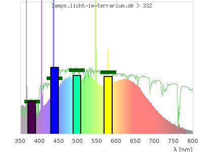Whereas a spectrometer measures the intensity in every tiny wavelength interval resulting in thousands of individual intensities, the human eye only measures three intensities detected by the three cones. The same is true for the reptile eye with usually three or four photoreceptors. Effectively the detailled spectrum displayed above reduces to a much compacter bar graph displayed below. The photoreceptor sensitivites from these L-Cone, M-Cone, S-Cone, and U-Cone are used, they are chosen as an average of measured reptile photoreceptor sensitivity curves. The bar graph also shows as reference the intensity seen by the three or four photoreceptors for average sunlight (id 1).