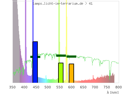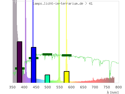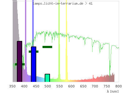 Whereas a spectrometer measures the intensity in every tiny wavelength interval resulting in thousands of individual intensities, the human eye only measures three intensities detected by the three cones. The same is true for the reptile eye with usually three or four photoreceptors. Effectively the detailled spectrum displayed above reduces to a much compacter bar graph displayed below. The photoreceptor sensitivites from these L-Cone, M-Cone, S-Cone, and U-Cone are used, they are chosen as an average of measured reptile photoreceptor sensitivity curves. The bar graph also shows as reference the intensity seen by the three or four photoreceptors for average sunlight (id 1).