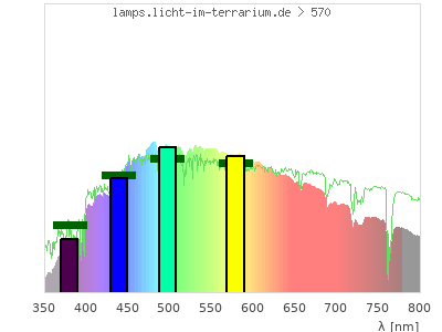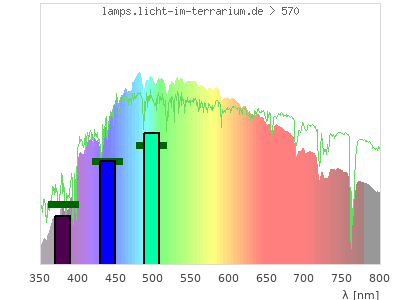 Whereas a spectrometer measures the intensity in every tiny wavelength interval resulting in thousands of individual intensities, the human eye only measures three intensities detected by the three cones. The same is true for the reptile eye with usually three or four photoreceptors. Effectively the detailled spectrum displayed above reduces to a much compacter bar graph displayed below. The photoreceptor sensitivites from these L-Cone, M-Cone, S-Cone, and U-Cone are used, they are chosen as an average of measured reptile photoreceptor sensitivity curves. The bar graph also shows as reference the intensity seen by the three or four photoreceptors for average sunlight (id 1).