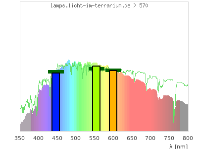 total ( 0 nm - 0 nm) 28600 µW/cm² = 286 W/m² UVC ( 0 nm - 280 nm) 5.08 µW/cm² = 0.0508 W/m² non-terrestrial ( 0 nm - 290 nm) 7.71 µW/cm² = 0.0771 W/m² total2 ( 250 nm - 880 nm) 28400 µW/cm² = 284 W/m² UVB (EU) ( 280 nm - 315 nm) 6.9 µW/cm² = 0.069 W/m² UVB (US) ( 280 nm - 320 nm) 7.21 µW/cm² = 0.0721 W/m² UVA+B ( 280 nm - 380 nm) 599 µW/cm² = 5.99 W/m² Solar UVB ( 290 nm - 315 nm) 4.25 µW/cm² = 0.0425 W/m² UVA D3 regulating ( 315 nm - 335 nm) 6.97 µW/cm² = 0.0697 W/m² UVA (EU) ( 315 nm - 380 nm) 592 µW/cm² = 5.92 W/m² UVA2 (medical definition) ( 320 nm - 340 nm) 16.8 µW/cm² = 0.168 W/m² UVA (US) ( 320 nm - 380 nm) 591 µW/cm² = 5.91 W/m² UVA1 (variant) ( 335 nm - 380 nm) 585 µW/cm² = 5.85 W/m² UVA1 (medical) ( 340 nm - 400 nm) 1120 µW/cm² = 11.2 W/m² vis. UVA ( 350 nm - 380 nm) 522 µW/cm² = 5.22 W/m² VIS Rep3 ( 350 nm - 600 nm) 16000 µW/cm² = 160 W/m² VIS Rep4 ( 350 nm - 700 nm) 22400 µW/cm² = 224 W/m² purple ( 380 nm - 420 nm) 1610 µW/cm² = 16.1 W/m² VIS ( 380 nm - 780 nm) 25100 µW/cm² = 251 W/m² VIS2 ( 400 nm - 680 nm) 20300 µW/cm² = 203 W/m² PAR ( 400 nm - 700 nm) 21300 µW/cm² = 213 W/m² tmp ( 400 nm - 1100 nm) 27400 µW/cm² = 274 W/m² blue ( 420 nm - 490 nm) 5010 µW/cm² = 50.1 W/m² green ( 490 nm - 575 nm) 6950 µW/cm² = 69.5 W/m² yellow ( 575 nm - 585 nm) 808 µW/cm² = 8.08 W/m² orange ( 585 nm - 650 nm) 4600 µW/cm² = 46 W/m² red ( 650 nm - 780 nm) 6130 µW/cm² = 61.3 W/m² IRA ( 700 nm - 1400 nm) 6110 µW/cm² = 61.1 W/m² IR2 ( 720 nm - 1100 nm) 5150 µW/cm² = 51.5 W/m² IRB ( 1400 nm - 3000 nm) 0 µW/cm² = 0 W/m²
