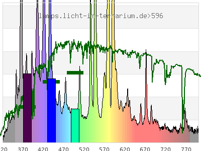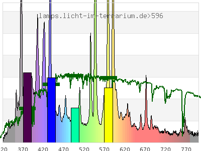Whereas a spectrometer measures the intensity in every tiny wavelength interval resulting in thousands of individual intensities, the human eye only measures three intensities detected by the three cones. The same is true for the reptile eye with usually three or four photoreceptors. Effectively the detailled spectrum displayed above reduces to a much compacter bar graph displayed below. The photoreceptor sensitivites from these L-Cone, M-Cone, S-Cone, and U-Cone are used, they are chosen as an average of measured reptile photoreceptor sensitivity curves. The bar graph also shows as reference the intensity seen by the three or four photoreceptors for average sunlight (ASTM spectrum).