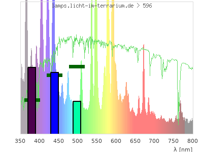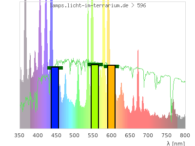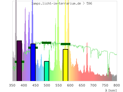 Whereas a spectrometer measures the intensity in every tiny wavelength interval resulting in thousands of individual intensities, the human eye only measures three intensities detected by the three cones. The same is true for the reptile eye with usually three or four photoreceptors. Effectively the detailled spectrum displayed above reduces to a much compacter bar graph displayed below. The photoreceptor sensitivites from these L-Cone, M-Cone, S-Cone, and U-Cone are used, they are chosen as an average of measured reptile photoreceptor sensitivity curves. The bar graph also shows as reference the intensity seen by the three or four photoreceptors for average sunlight (id 1).