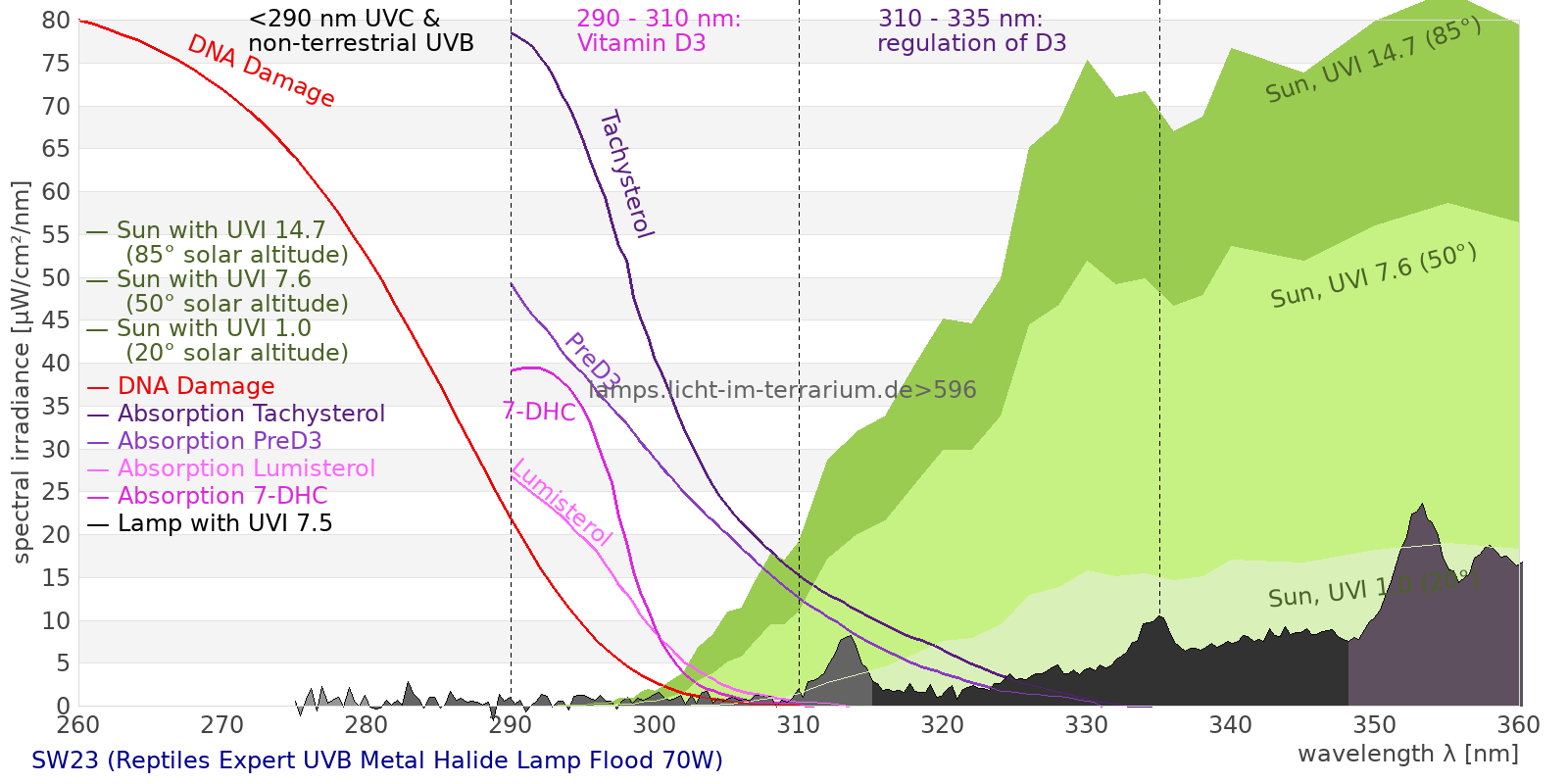 This process prevents any overdose of vitamin D3 from UV radiation with a spectrum similar to sunlight. As a comparison the solar spectra at 20°(id:14) and at 85°(id:21) solar angle are shown.