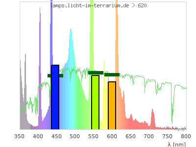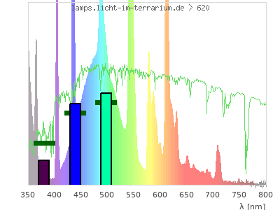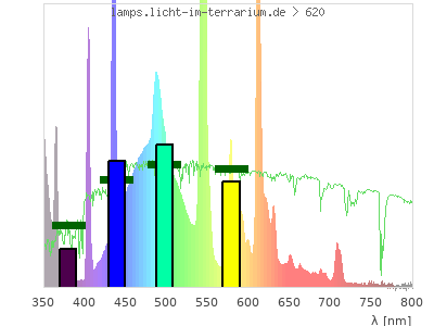 Whereas a spectrometer measures the intensity in every tiny wavelength interval resulting in thousands of individual intensities, the human eye only measures three intensities detected by the three cones. The same is true for the reptile eye with usually three or four photoreceptors. Effectively the detailled spectrum displayed above reduces to a much compacter bar graph displayed below. The photoreceptor sensitivites from these L-Cone, M-Cone, S-Cone, and U-Cone are used, they are chosen as an average of measured reptile photoreceptor sensitivity curves. The bar graph also shows as reference the intensity seen by the three or four photoreceptors for average sunlight (id 1).