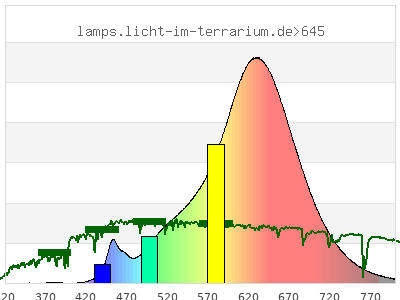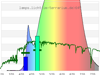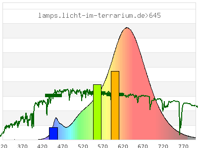 total ( 0 nm - 0 nm) 2800 µW/cm² = 28 W/m² UVC ( 0 nm - 280 nm) 0 µW/cm² = 0 W/m² non-terrestrial ( 0 nm - 290 nm) 0 µW/cm² = 0 W/m² total2 ( 250 nm - 880 nm) 2800 µW/cm² = 28 W/m² UVB (EU) ( 280 nm - 315 nm) 0 µW/cm² = 0 W/m² UVB (US) ( 280 nm - 320 nm) 0 µW/cm² = 0 W/m² UVA+B ( 280 nm - 380 nm) 1.1 µW/cm² = 0.011 W/m² Solar UVB ( 290 nm - 315 nm) 0 µW/cm² = 0 W/m² UVA D3 regulating ( 315 nm - 335 nm) 0 µW/cm² = 0 W/m² UVA (EU) ( 315 nm - 380 nm) 1.1 µW/cm² = 0.011 W/m² UVA2 (medical definition) ( 320 nm - 340 nm) 0 µW/cm² = 0 W/m² UVA (US) ( 320 nm - 380 nm) 1.1 µW/cm² = 0.011 W/m² UVA1 (variant) ( 335 nm - 380 nm) 1.1 µW/cm² = 0.011 W/m² UVA1 (medical) ( 340 nm - 400 nm) 1.72 µW/cm² = 0.0172 W/m² vis. UVA ( 350 nm - 380 nm) 0.99 µW/cm² = 0.0099 W/m² VIS Rep3 ( 350 nm - 600 nm) 1000 µW/cm² = 10 W/m² VIS Rep4 ( 350 nm - 700 nm) 2550 µW/cm² = 25.5 W/m² purple ( 380 nm - 420 nm) 1.99 µW/cm² = 0.0199 W/m² VIS ( 380 nm - 780 nm) 2770 µW/cm² = 27.7 W/m² VIS2 ( 400 nm - 680 nm) 2370 µW/cm² = 23.7 W/m² PAR ( 400 nm - 700 nm) 2550 µW/cm² = 25.5 W/m² tmp ( 400 nm - 1100 nm) 2800 µW/cm² = 28 W/m² blue ( 420 nm - 490 nm) 146 µW/cm² = 1.46 W/m² green ( 490 nm - 575 nm) 527 µW/cm² = 5.27 W/m² yellow ( 575 nm - 585 nm) 116 µW/cm² = 1.16 W/m² orange ( 585 nm - 650 nm) 1140 µW/cm² = 11.4 W/m² red ( 650 nm - 780 nm) 842 µW/cm² = 8.42 W/m² IR2 ( 655 nm - 685 nm) 403 µW/cm² = 4.03 W/m² IRA ( 700 nm - 1400 nm) 253 µW/cm² = 2.53 W/m² IRB ( 1400 nm - 3000 nm) 0 µW/cm² = 0 W/m²