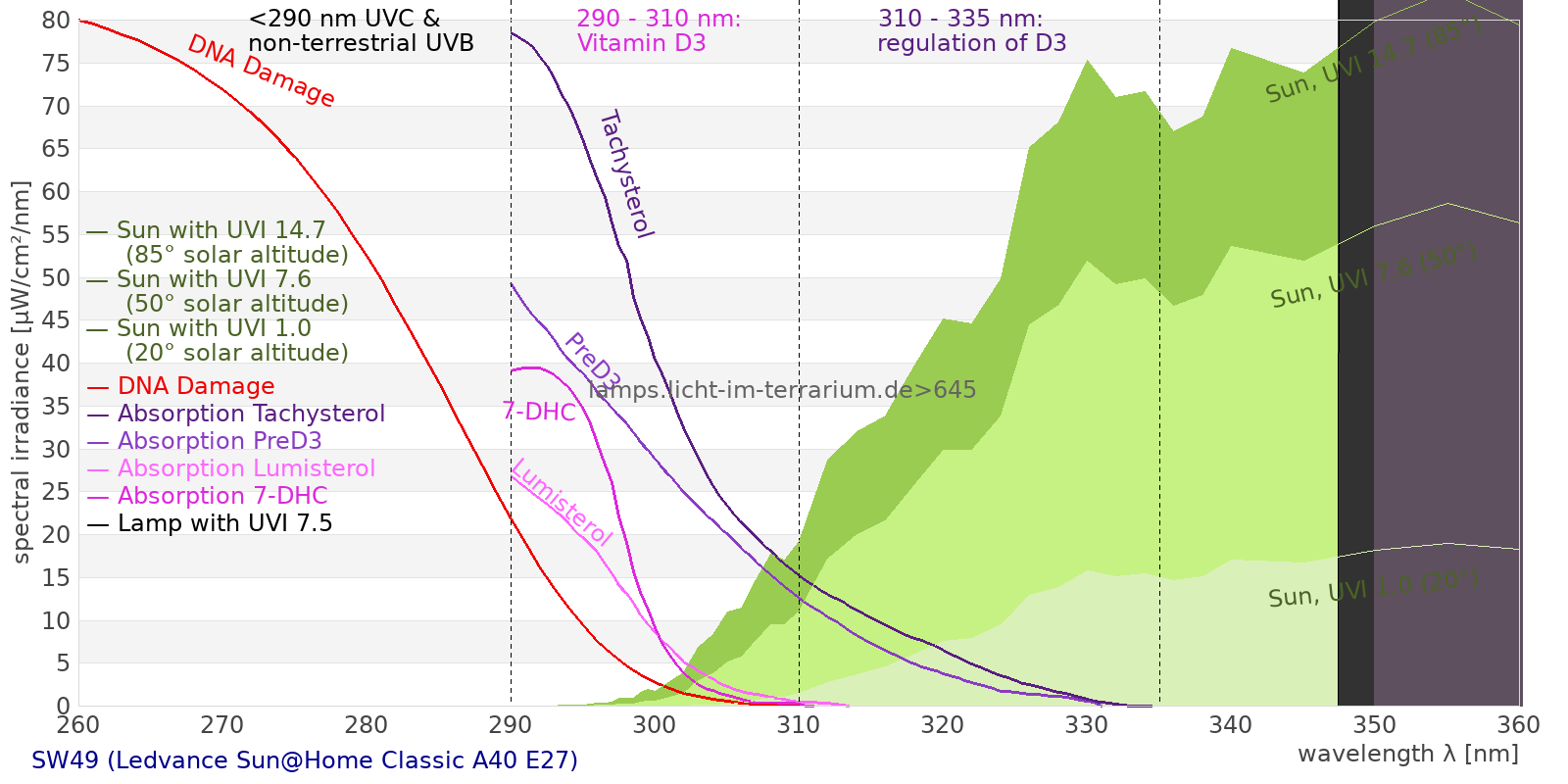This process prevents any overdose of vitamin D3 from UV radiation with a spectrum similar to sunlight. As a comparison the solar spectra at 20°(id:14) and at 85°(id:21) solar angle are shown.