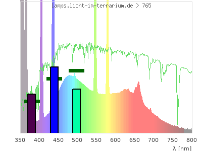 Whereas a spectrometer measures the intensity in every tiny wavelength interval resulting in thousands of individual intensities, the human eye only measures three intensities detected by the three cones. The same is true for the reptile eye with usually three or four photoreceptors. Effectively the detailled spectrum displayed above reduces to a much compacter bar graph displayed below. The photoreceptor sensitivites from these L-Cone, M-Cone, S-Cone, and U-Cone are used, they are chosen as an average of measured reptile photoreceptor sensitivity curves. The bar graph also shows as reference the intensity seen by the three or four photoreceptors for average sunlight (id 1).
